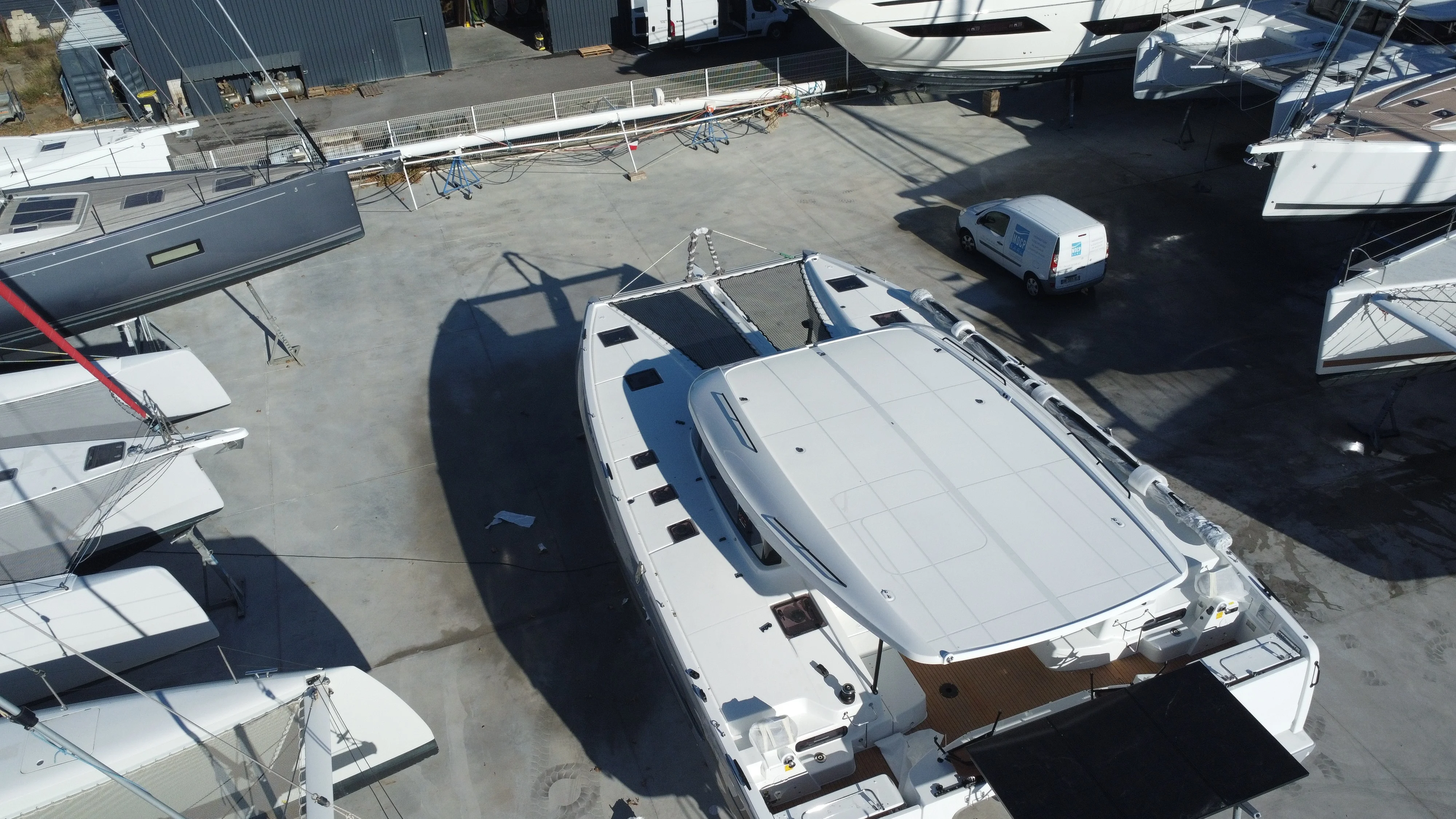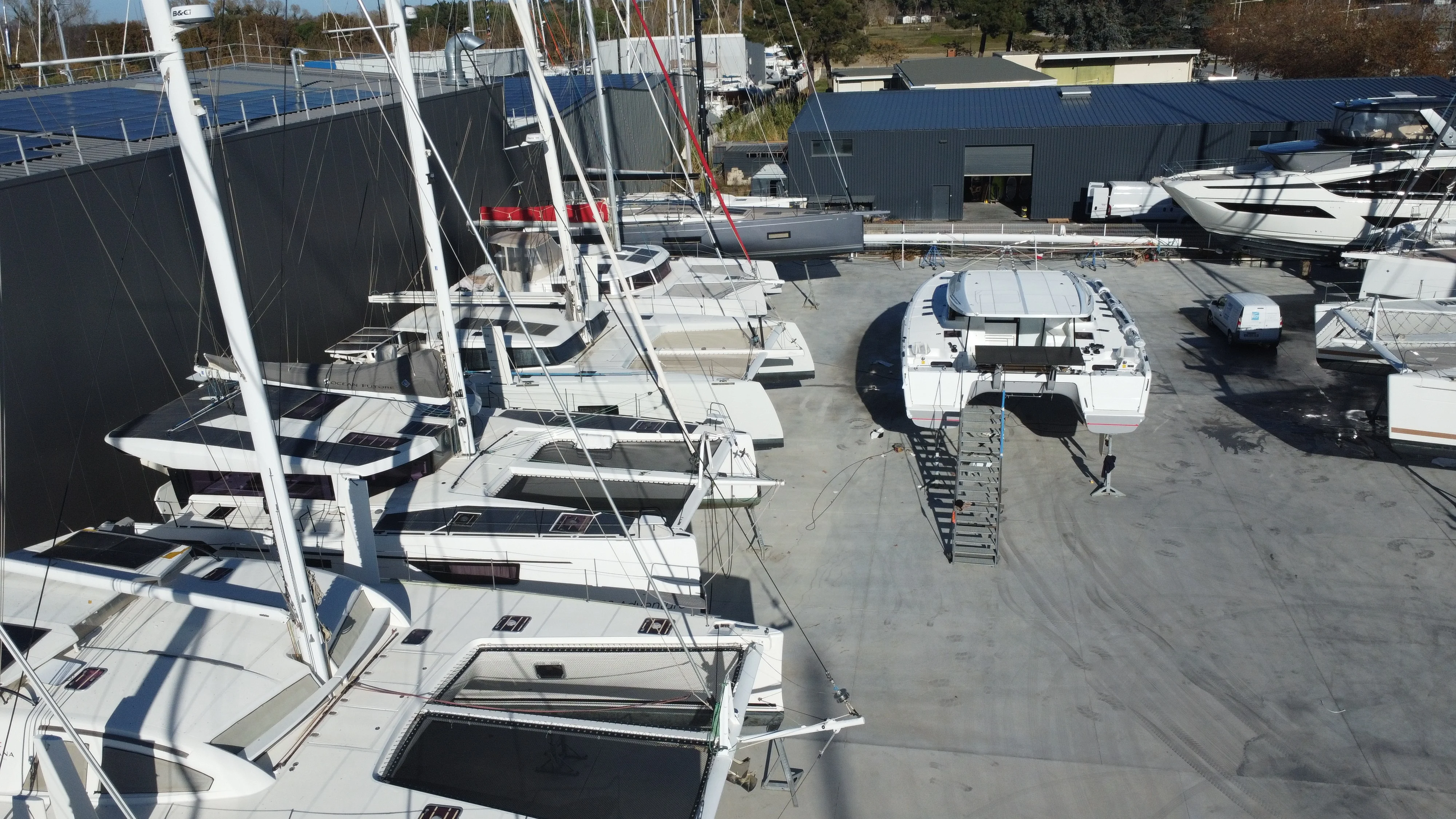 Vue aérienne du chantier où les catamarans occupent chaque espace disponible. En ce mois de décembre, l’activité est particulièrement intense, entre mises à niveau techniques, entretiens hivernaux et préparations en vue de la prochaine saison de navigation.