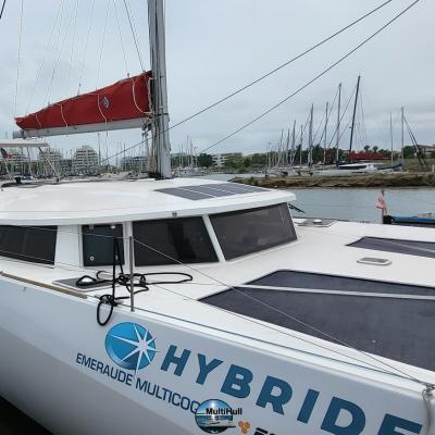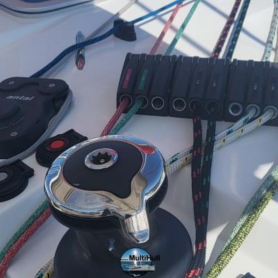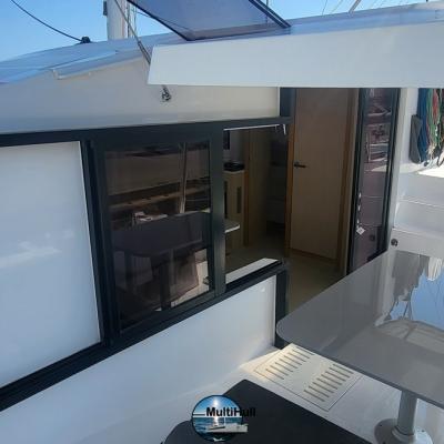 Pont : Coffres à gaz et mouillage, Trampoline en 2 parties, Baille à mouillage, Davier d'ancre inox intégré sous delphinière, Echelle de bain, relevage annexe par LINE DRIVER avec télécommande avec bers, Gel coat de coque gris clair RAL 7047, Guindeau électrique 12V avec commande à pied, Commande de guindeau et compteur de chaine à la console de barre, Douchette eau chaude/froide sur jupe flotteur bâbord, Kit amarrage (4 amarres et 6 pare-battages), Bimini rigide de cockpit, Propulseur d'étrave 12V avec batteries et chargeur dédiés, Kit mouillage (50m câblot + 60m chaine + ancre Kobra 20kg), Antifouling avec primer époxy Bimini du poste de barre, Équipement de sécurité pour 8 personnes avec EPIRB, Lignes de vie, gilets auto, Radeau de survie 8 PAX, Annexe Highfield 3,1m UltraLite Alu/Hypalon avec moteur hors-bord 15CV