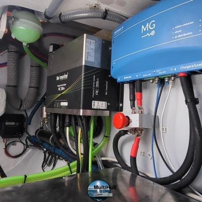 Electricité: 1 jeu batteries services 12V 495A, 1 batterie Optima démarrage 12V de 50A, Eclairages intérieurs en LED, Feux de navigation en LED, Réseau 230V : 6 prises 230V + ligne de quai 25 m, chargeur de quai 220V/12V service et moteur, Chargeur Convertisseur Victron Multiplus Compact 12/220V 2000W 80A,