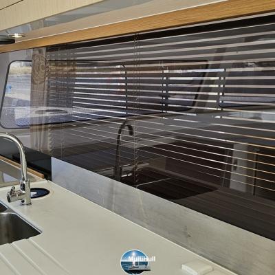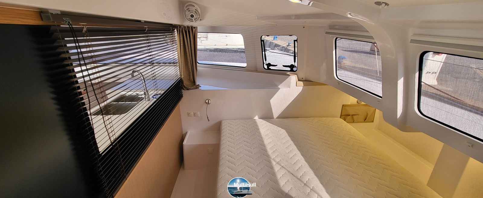 Salle d'eau lavabo et douche eau chaude/eau froide sous pression, Liseuses avec prise USB, Table de cockpit "dîner" et table de carré, Menuiseries ALPI, Rideaux dans les cabines, Sellerie dans le cockpit et le carré, sol en Bolon, Cloisons structurelles et épontilles de roof en carbone,